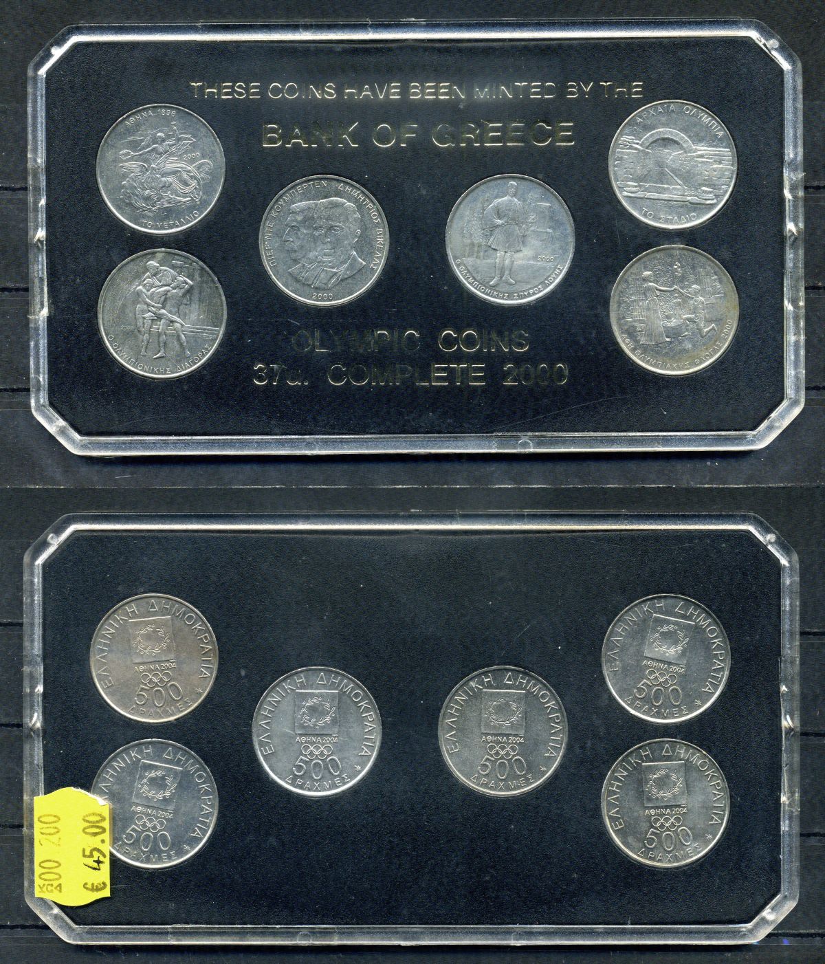 Греция набор из 6 монет (500 драхм) 2000 в оригинальной упаковке (37a). XXVIII летние Олимпийские Игры, Афины 2004 - Стадион, Олимпийский огонь, диагор, Президент Викелас и Барон Кубертен, спиридон Луис, золотая медаль KM 175, 176, 177, 178, 179, 180 медн