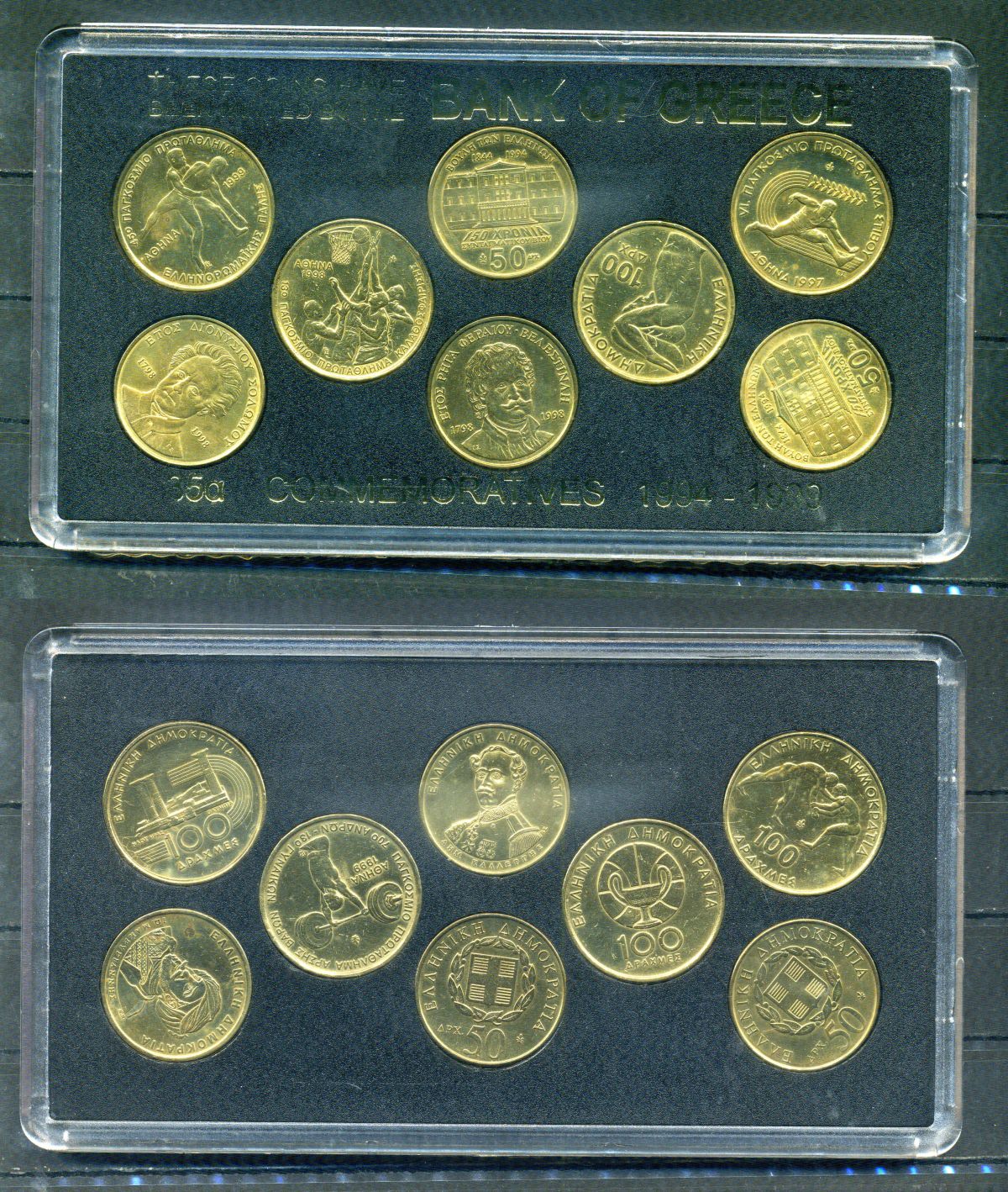 Греция набор из 8 монет (50 и 100 драхм) 1994-1999 в оригинальной упаковке (35a). 150 лет Конституции, Деметриос Калергис, Яннис Макрияннис, 200 лет со дня смерти Ригаса Фереоса, 200 лет со дня рождения Дионисиоса Соломоса, VI Чемпионат мира по лёгкой атл