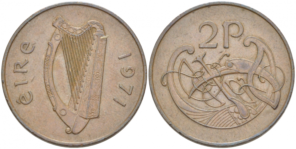 ИРЛАНДИЯ 2 ПЕНСА 1971 ВИНЬЕТКА В ВИДЕ СТИЛИЗОВАННОЙ ПТИЦЫ ИЗ ВТОРОЙ БИБЛИИ КАРЛА II ЛЫСОГО KM 21 бронза 259-1111