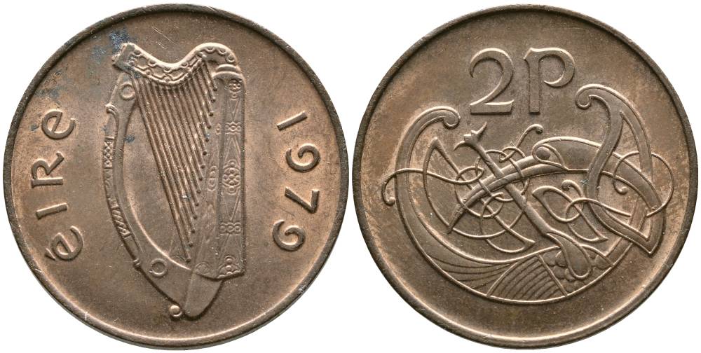 ИРЛАНДИЯ 2 ПЕНСА 1979 ВИНЬЕТКА В ВИДЕ СТИЛИЗОВАННОЙ ПТИЦЫ ИЗ ВТОРОЙ БИБЛИИ КАРЛА II ЛЫСОГО KM 21 бронза UNC 4391-1211