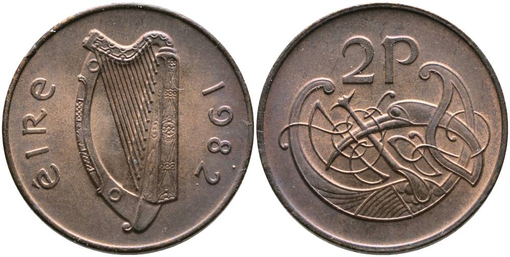 ИРЛАНДИЯ 2 ПЕНСА 1982 ВИНЬЕТКА В ВИДЕ СТИЛИЗОВАННОЙ ПТИЦЫ ИЗ ВТОРОЙ БИБЛИИ КАРЛА II ЛЫСОГО KM 21 бронза 4110-422