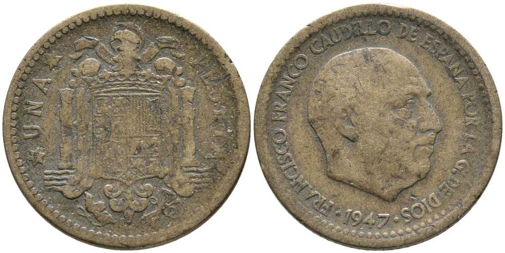 ИСПАНИЯ 1 ПЕСЕТА 1947 (53) ФРАНСИСКО ФРАНКО ДИКТАТОР ИСПАНИИ (1939-1975) KM 775 алюминиевая бронза 110-1113