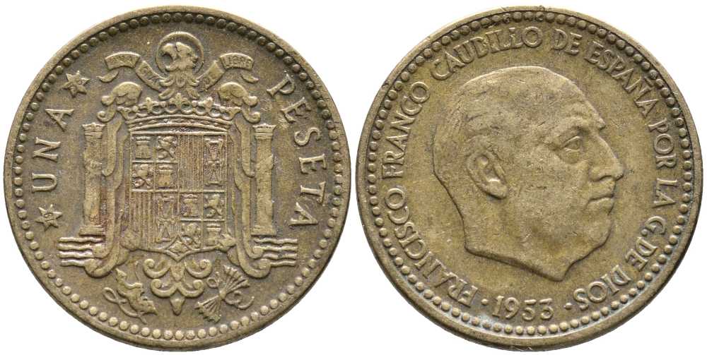 ИСПАНИЯ 1 ПЕСЕТА 1953 (56) ФРАНСИСКО ФРАНКО ДИКТАТОР ИСПАНИИ (1939-1975) KM 775 алюминиевая бронза 110-1126