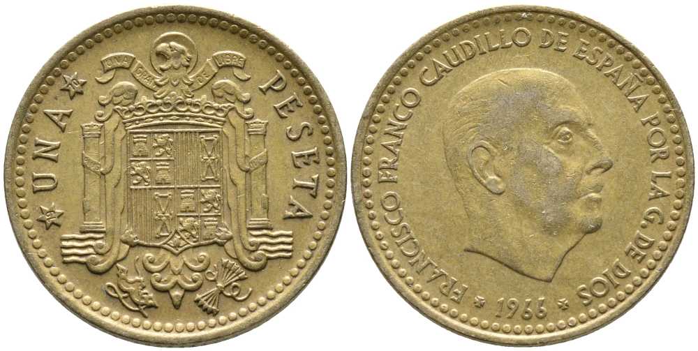 ИСПАНИЯ 1 ПЕСЕТА 1966 (70) ФРАНСИСКО ФРАНКО ДИКТАТОР ИСПАНИИ (1939-1975) KM 796 алюминиевая бронза 110-1213