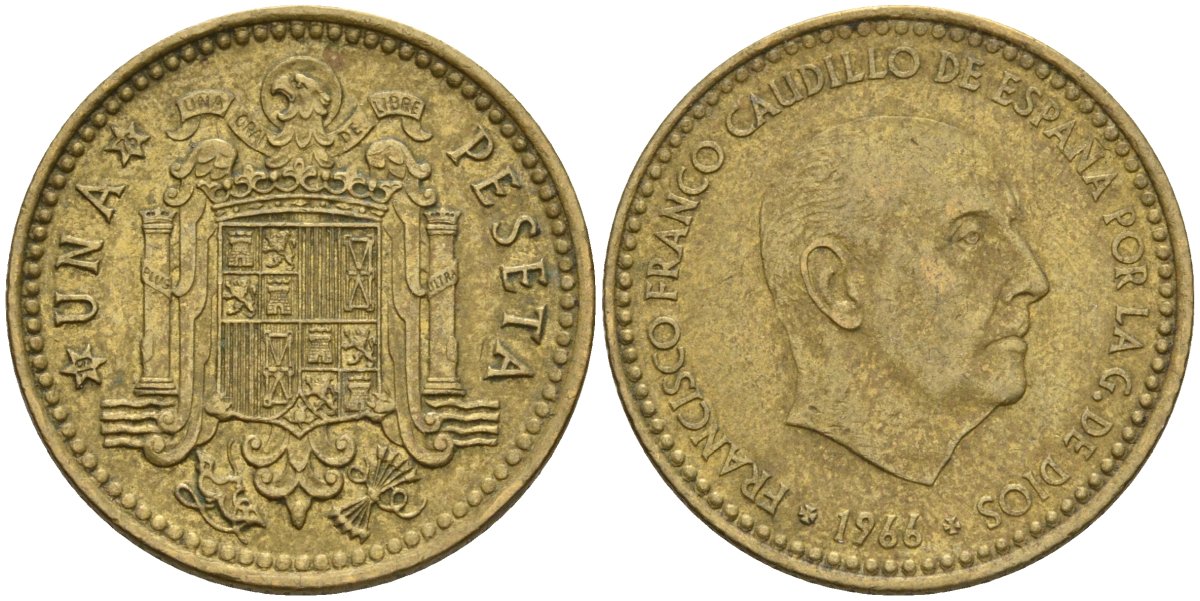Испания 1 песета 1966 (75) Франсиско Франко (1939-1975) KM 796 алюминиевая бронза 4604-112