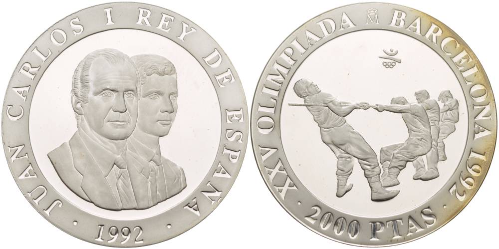 ИСПАНИЯ 2000 ПЕСЕТ 1992 XXV ОЛИМПИЙСКИЕ ИГРЫ В БАРСЕЛОНЕ 1992 ГОДА, ПЕРЕТЯГИВАНЬЕ КАНАТА, ПРОБА 925, ВЕС 26,7 ГР., ТИРАЖ 33980 ЭКЗ. KM 911 серебро PROOF 1088-10-54