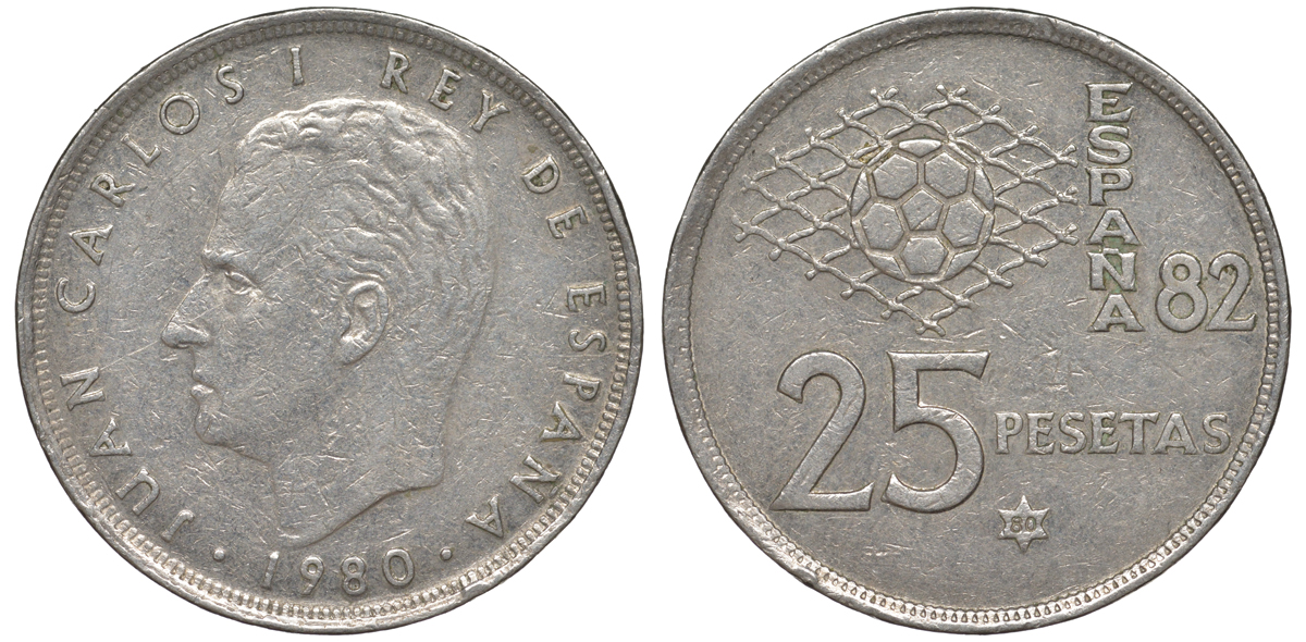 Испания 25 песет 1980 (80) чемпионат мира по футболу в Испании 1982 года, Хуан Карлос I (1975-) KM 818 медно-никель 45-726