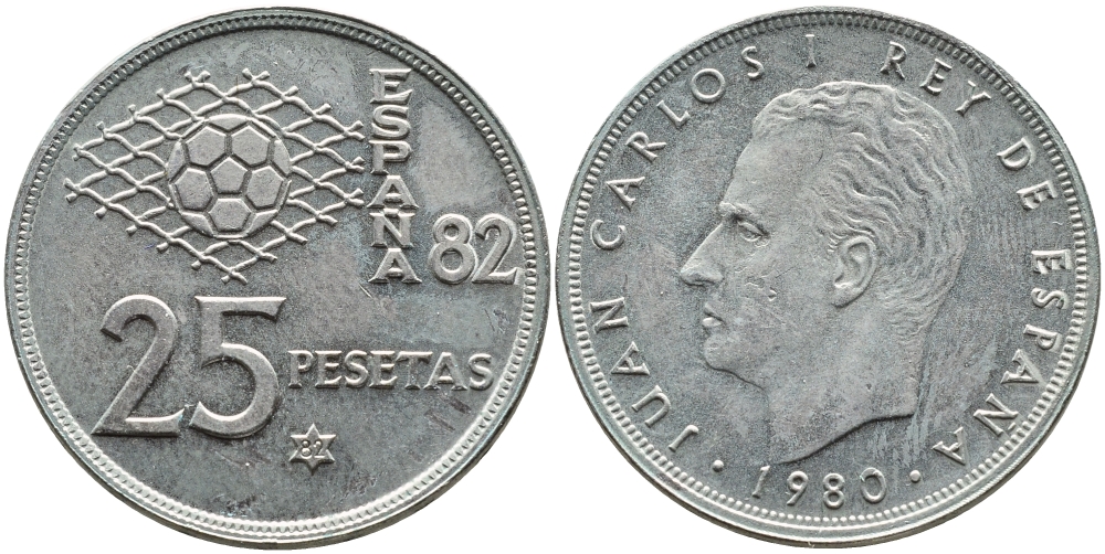 Испания 25 песет 1980 (82) чемпионат мира по футболу в Испании 1982 года, Хуан Карлос I (1975-) KM 818 медно-никель 4393-245