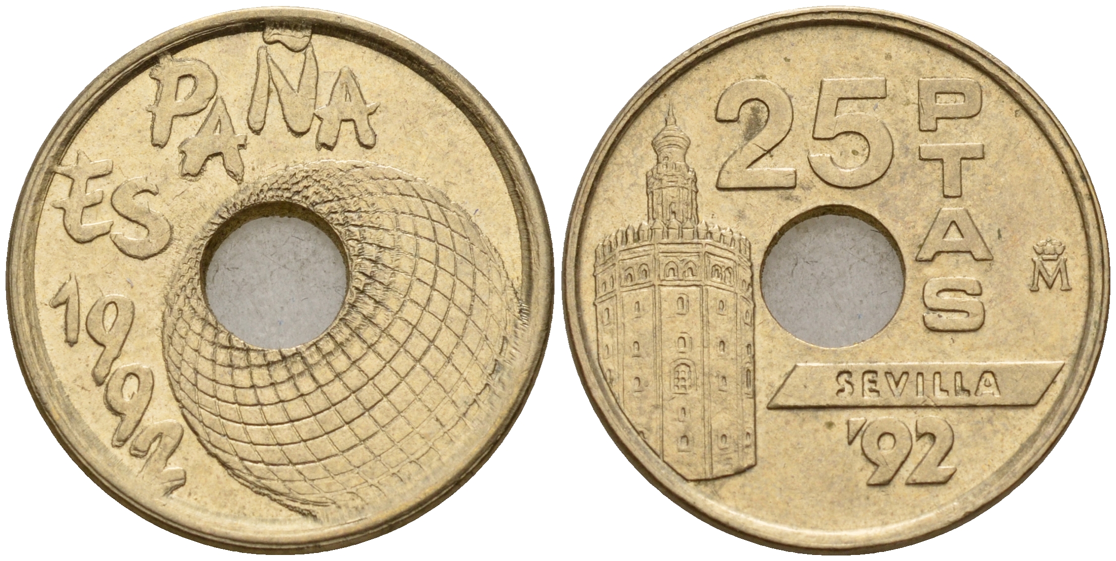 Испания 25 песет 1992 золотая башня в Севилье, EXPO 1992, Хуан Карлос I (1975-2014) KM 905 никель-бронза 4598-1211