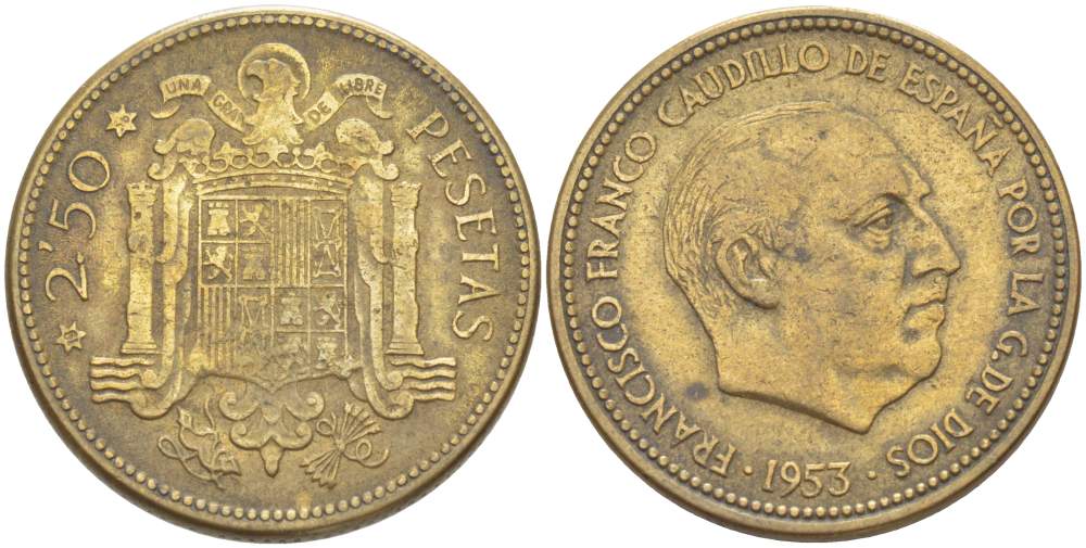 ИСПАНИЯ 2,5 ПЕСЕТЫ 1953 (56) ФРАНСИСКО ФРАНКО ДИКТАТОР ИСПАНИИ (1939-1975) KM 785 алюминиевая бронза 4523-453