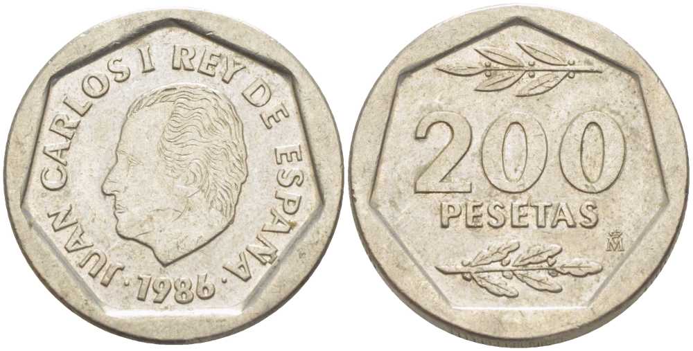 ИСПАНИЯ 200 ПЕСЕТ 1986 ХУАН КАРЛОС I (1975-) KM 829 медно-никель 210-913