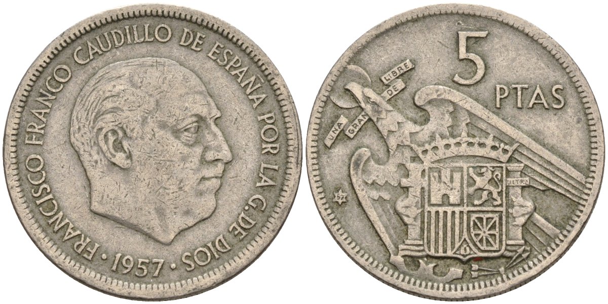 Испания 5 песет 1957 (67) Франсиско Франко (1939 - 1975) KM 786 медно-никель 4155-545