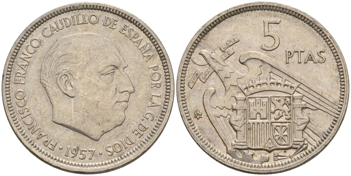 Испания 5 песет 1957 (74) Франсиско Франко (1939 - 1975) KM 786 медно-никель 4155-613