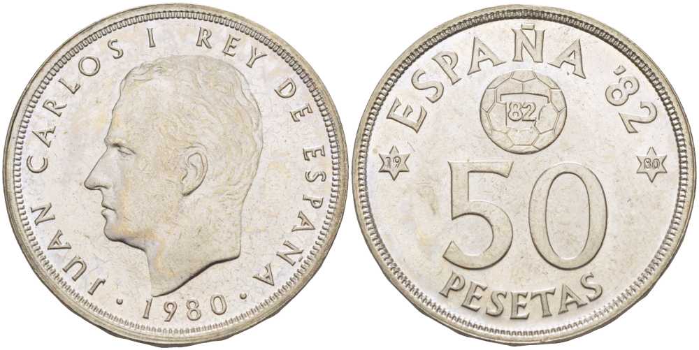 Испания 50 песет 1980 (80) чемпионат мира по футболу в Испании 1982 года, Хуан Карлос I (1975-) KM 819 медно-никель 3334-346