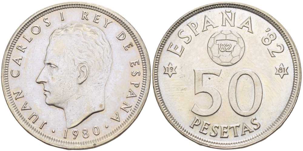 Испания 50 песет 1980 (81) чемпионат мира по футболу в Испании 1982 года, Хуан Карлос I (1975-) KM 819 медно-никель 4403-416