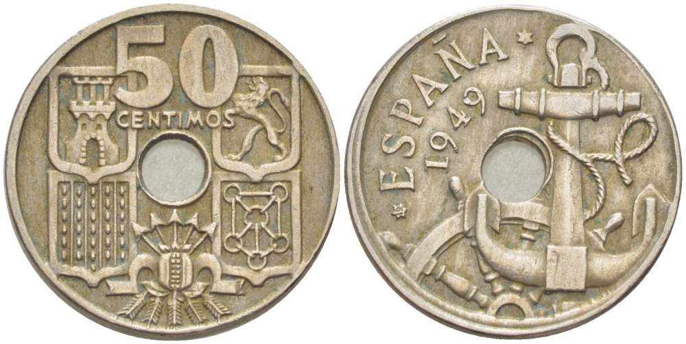 ИСПАНИЯ 50 СЕНТИМО 1949 ФРАНСИСКО ФРАНКО ДИКТАТОР ИСПАНИИ (1939- 1975), МОРСКАЯ АТРИБУТИКА KM 777 медно-никель 4523-846