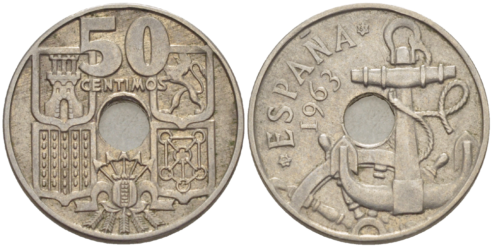 ИСПАНИЯ 50 СЕНТИМО 1963 (65) ФРАНСИСКО ФРАНКО ДИКТАТОР ИСПАНИИ ( 1939- 1975) , МОРСКАЯ АТРИБУТИКА KM 777 медно-никель 216-532