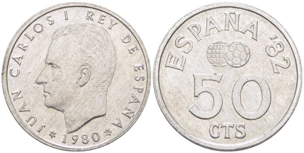 Испания 50 сентимо 1980 (80) чемпионат мира по футболу в Испании 1982 года, Хуан Карлос I (1975-) KM 815 алюминий 214-621