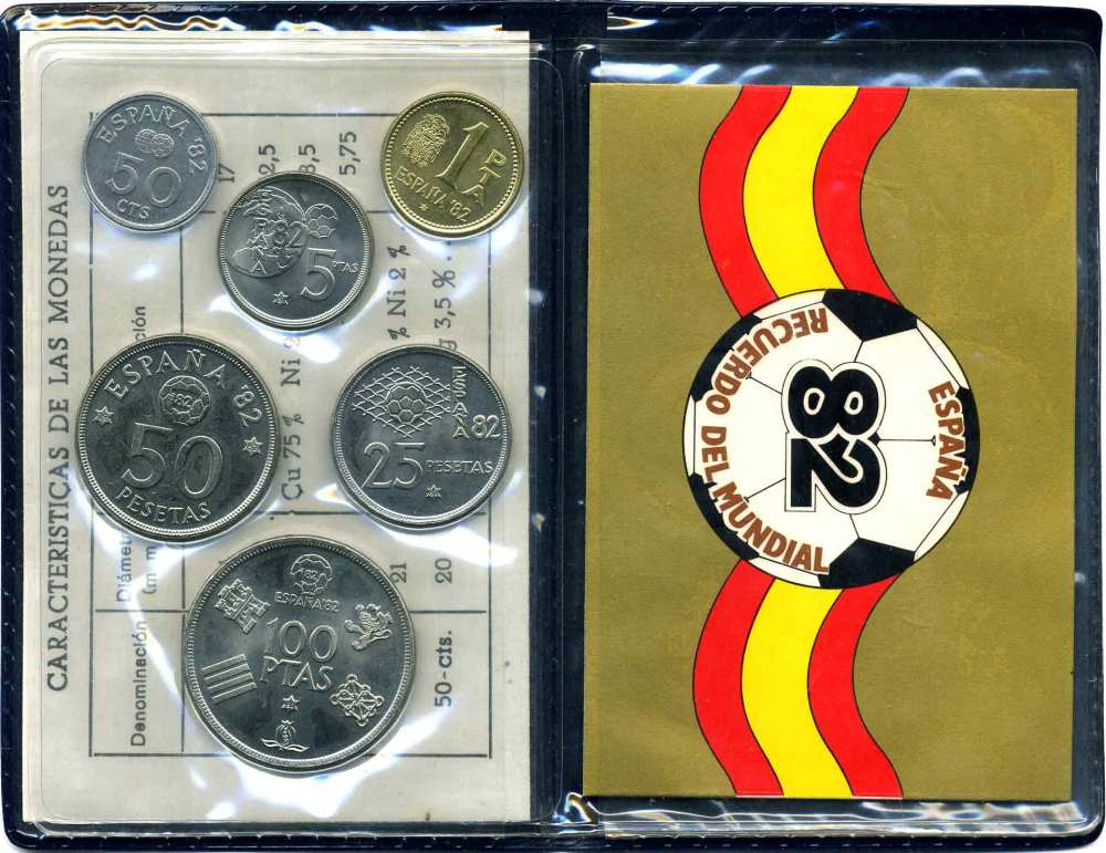 Испания официальный набор из 6 монет (50 сентимов; 1, 5, 25, 50 и 100 песет) 1980 чемпионат мира по футболу в Испании 1982 года KM MS11 (815, 816, 817, 818, 819 и 820) UNC 5-4-3-68