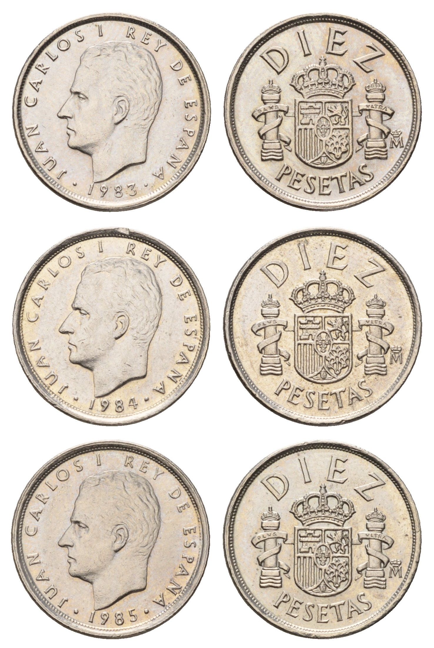 Испания полный набор выпуска из 3 (10 песет) 1983, 1984 и 1985 Хуан Карлос I (1975-2014) KM 827 медно-никель aUNC 3458-347-349