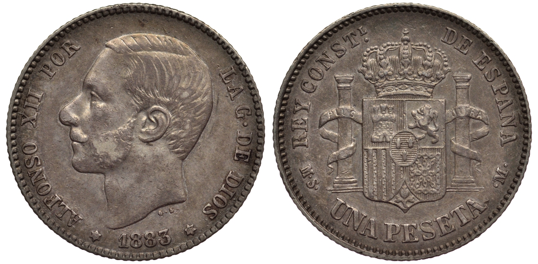 ИСПАНИЯ 1 ПЕСЕТА 1883 (83) MS-M, АЛЬФОНСО XII (1874-1885) KM 686 (Y-B76) серебро aUNC 1521-143