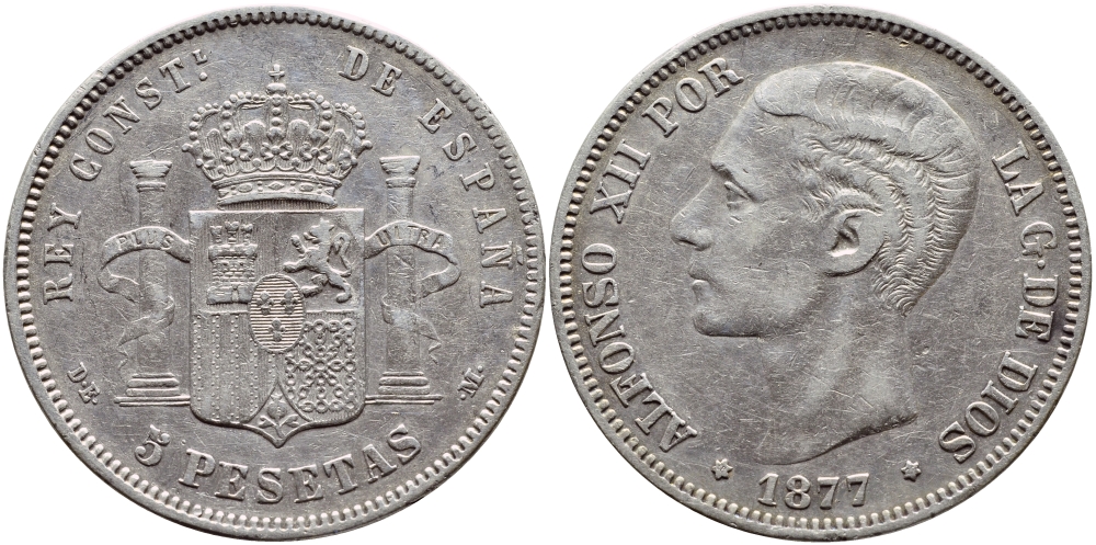 ИСПАНИЯ 5 ПЕСЕТ 1877 (77) DE-M, АЛЬФОНСО XII KM 676 серебро 02-224-12