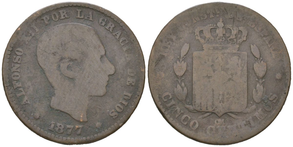 Испания 5 сентимо 1877 OM, Альфонсо XII (1874-1885) KM 674 бронза 4616-817