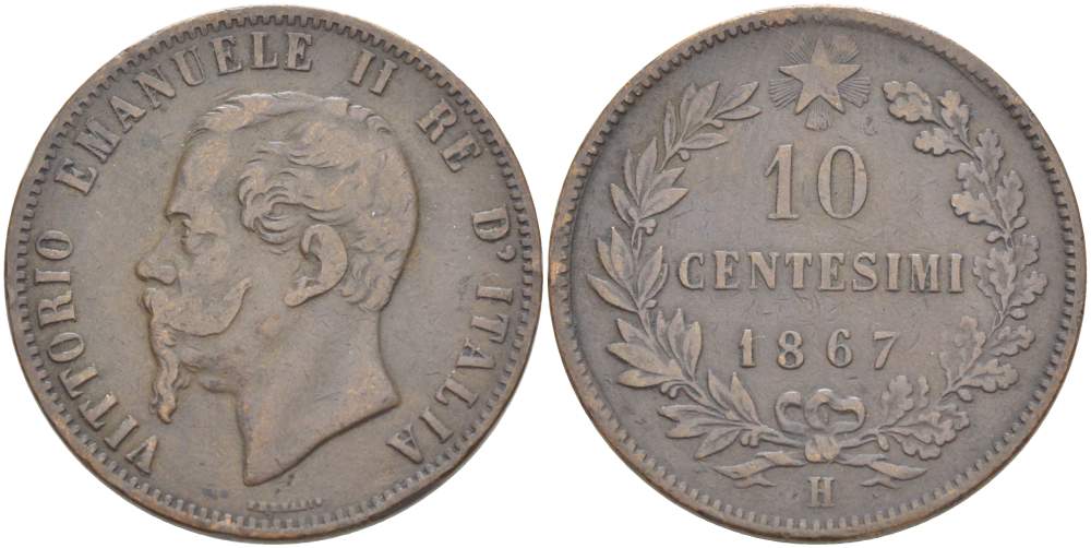 Италия 10 чентезимо 1867 H, Виктор Эммануил II (1861-1878) KM 11.3 медь 4526-842