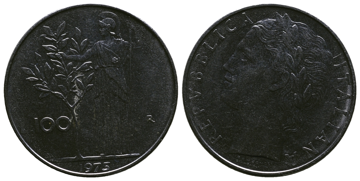 ИТАЛИЯ 100 ЛИР 1975 R, АФИНА KM 96.1 нержавеющая сталь 4384-944