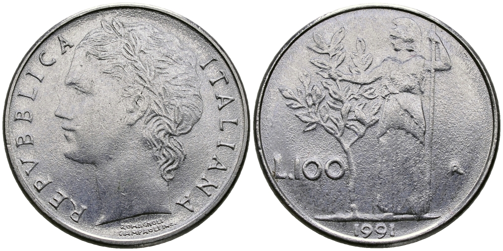 Италия 100 лир 1991 R, Афина в доспехах KM 96.2 нержавеющая сталь 98-157