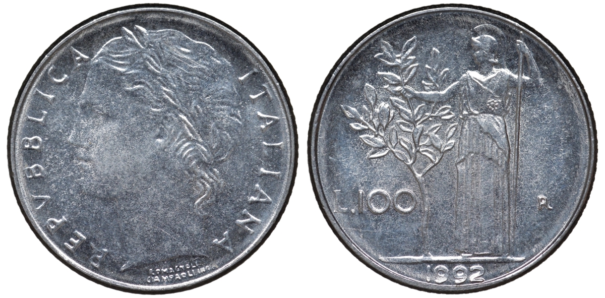 Италия 100 лир 1992 KM нержавеющая сталь 4596-364