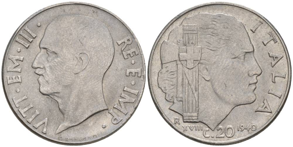 ИТАЛИЯ 20 ЧЕНТЕЗИМО 1940 R, ГОД XVIII, ВИКТОР ЭММАНУИЛ III (1900-1946), МАГНИТНАЯ, ГУРТ РИФЛЁНЫЙ KM 75b, VEM3. 1025 нержавеющая сталь 3853-451