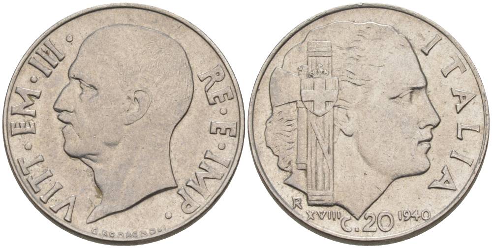 ИТАЛИЯ 20 ЧЕНТЕЗИМО 1940 R, ГОД XVIII, ВИКТОР ЭММАНУИЛ III (1900-1946), СЛАБО МАГНИТНАЯ, ГУРТ РИФЛЁНЫЙ KM 75d, VEM3. 1026a) нержавеющая сталь 3853-532