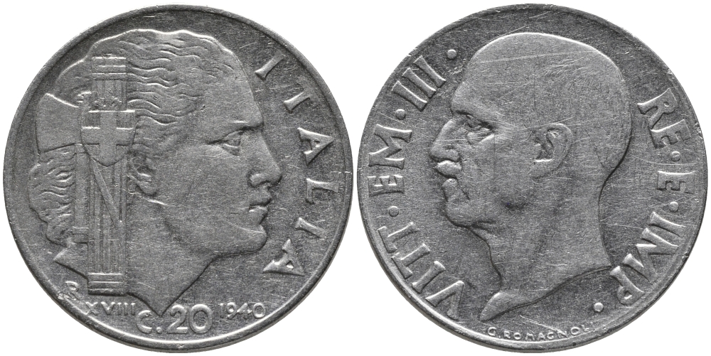 ИТАЛИЯ 20 ЧЕНТЕЗИМО 1940 R, ВИКТОР ИМАНУИЛ, XVIII ГОД, НЕМАГНИТНАЯ KM 75d нержавеющая сталь 83-1056
