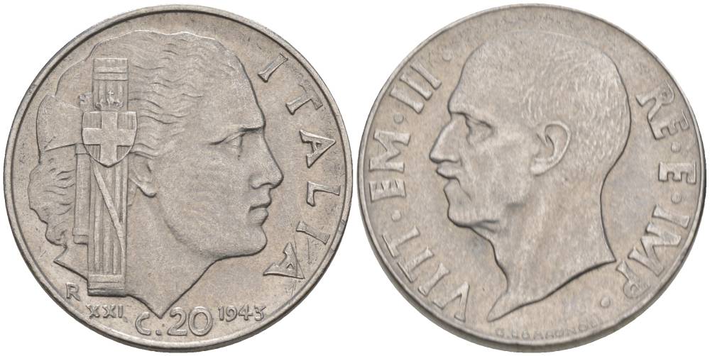 ИТАЛИЯ 20 ЧЕНТЕЗИМО 1943 R, ГОД XXI, ВИКТОР ЭММАНУИЛ III (1900-1946), МАГНИТНАЯ KM 75b, VEM3. 1031 нержавеющая сталь 3853-422