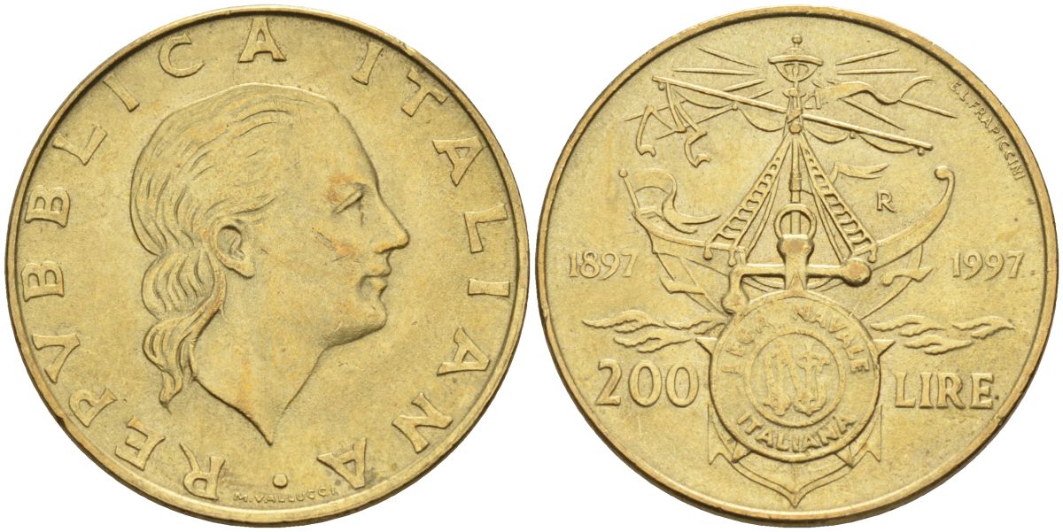 Италия 200 лир 1997 R, 100 лет Итальянской морской лиги (1897-1997) KM 186 алюминиевая бронза 4126-133