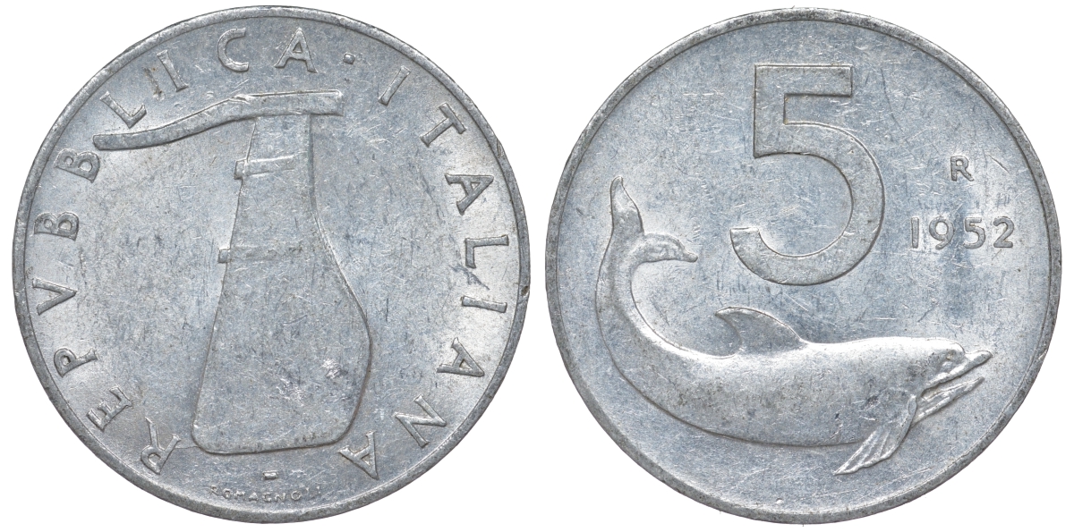 Италия 5 лир 1952 R, плуг, дельфин KM 92 алюминий 4596-421