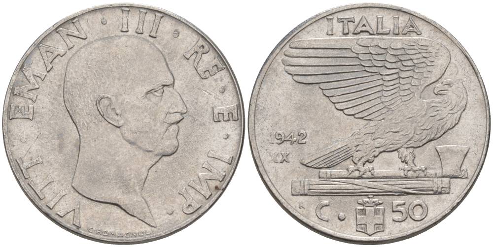 ИТАЛИЯ 50 ЧЕНТЕЗИМО 1942 R, ГОД XX, ВИКТОР ЭММАНУИЛ III (1900-1946) KM 76b, VEM3. 1064 нержавеющая сталь 3853-417
