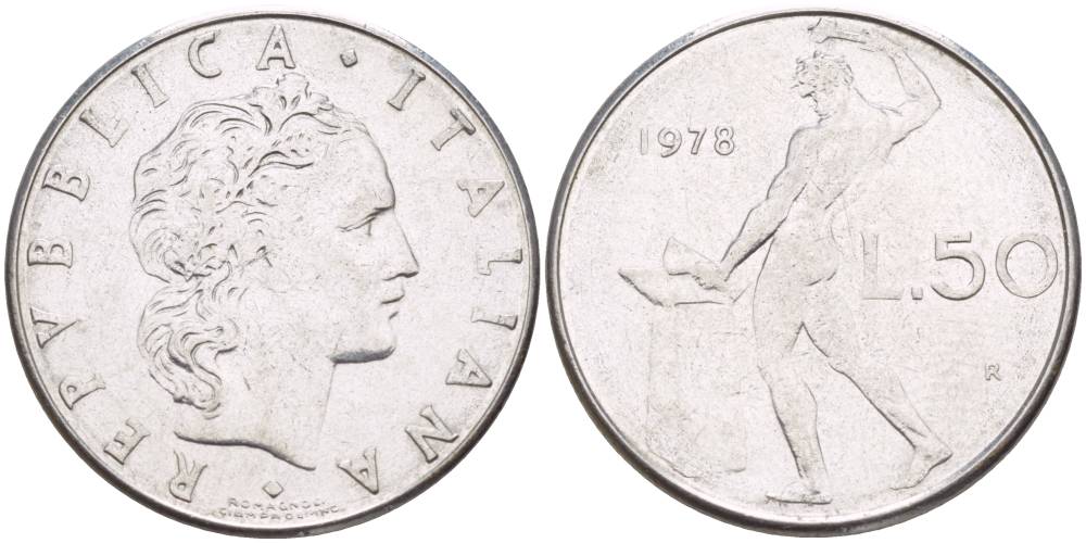ИТАЛИЯ 50 ЛИР 1978 R, БОГ ОГНЯ ВУЛКАН У НАКОВАЛЬНИ KM 95.1 нержавеющая сталь 4525-937