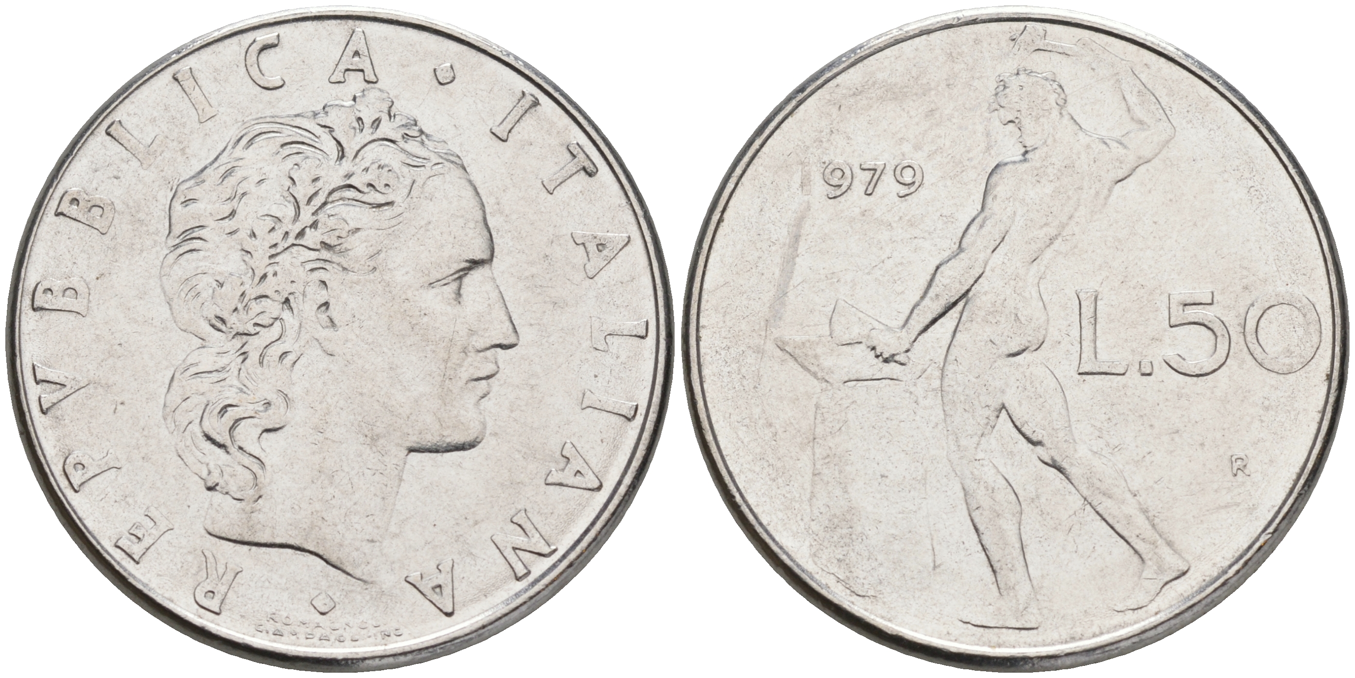 ИТАЛИЯ 50 ЛИР 1979 R, КУЗНЕЦ KM 95.1 нержавеющая сталь 4561-833