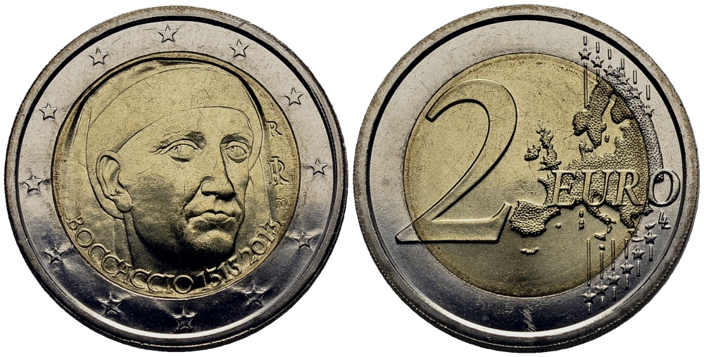ИТАЛИЯ 2 ЕВРО 2013 700 ЛЕТ СО ДНЯ РОЖДЕНИЯ ДЖОВАННИ БОККАЧЧО KM 358 биметалл UNC M6-17