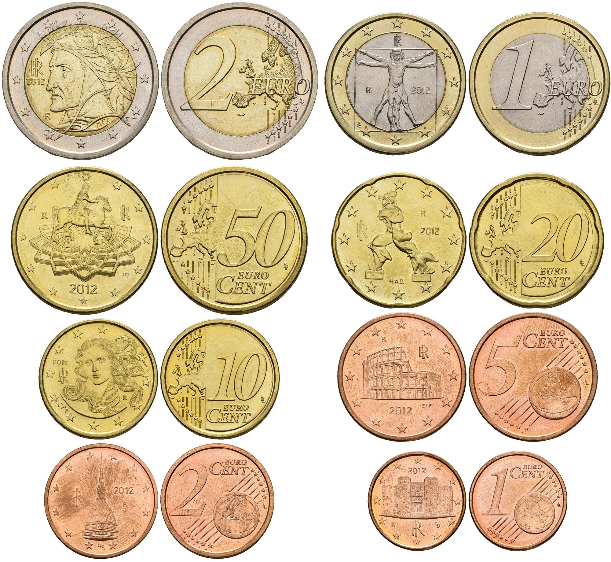 Италия евронабор из 8 монет 2012 1, 2, 5, 10, 20, 50 евроцентов, 1 и 2 евро KM 210, 211, 212, 247, 248, 249, 250, 251 UNC N6-30