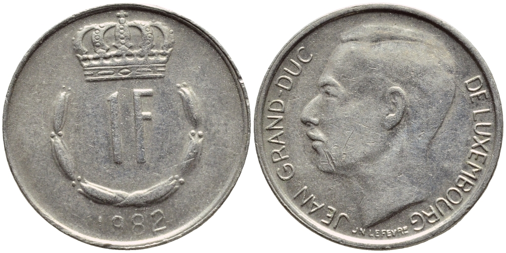 Люксембург 1 франк 1982 Великий герцог Жан (1964-1999) KM 55 медно-никель 4397-452