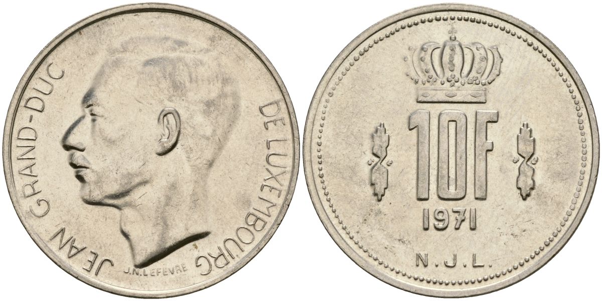 Люксембург 10 франков 1971 Великий герцог Жан (1964-2000) KM 57 никель 4120-1136