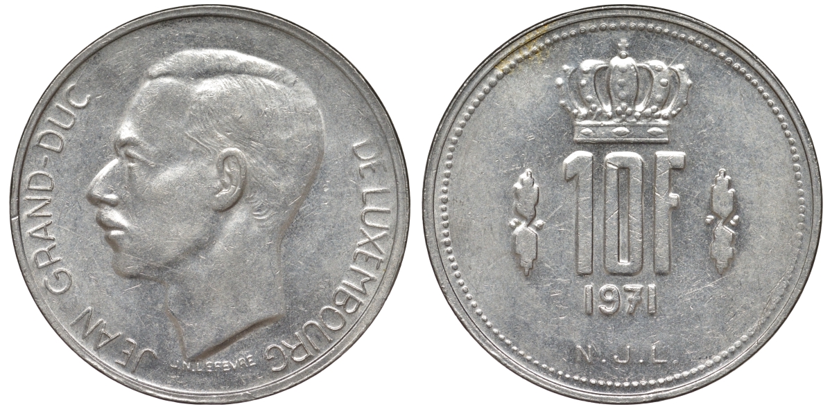 Люксембург 10 франков 1971 Великий герцог Жан (1964-2000) KM 57 никель 4144-136