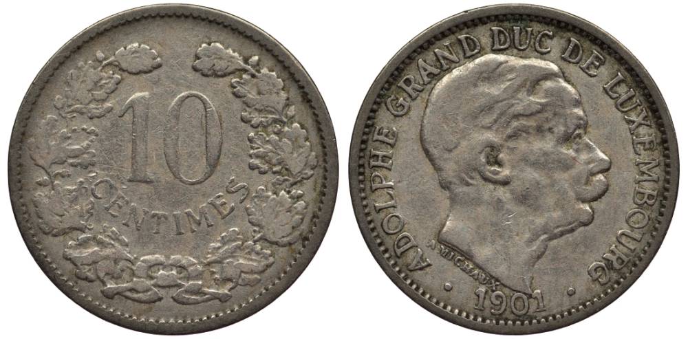 ЛЮКСЕМБУРГ 10 САНТИМОВ 1901 АДОЛЬФ (1890-1905) KM 25 медно-никель 4549-923