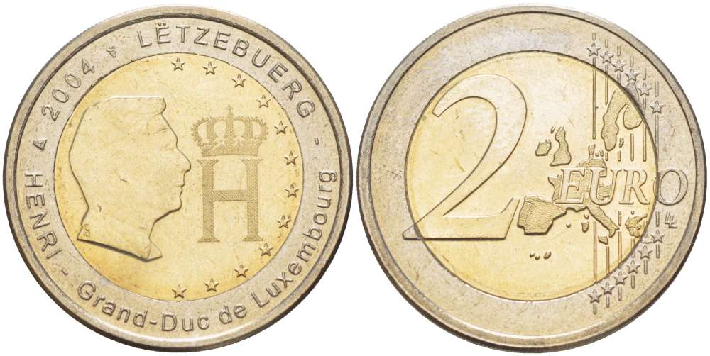 Люксембург 2 евро 2004 Портрет и монограмма герцога Люксембурга Анри Нассау KM 85 биметалл UNC 4517-644