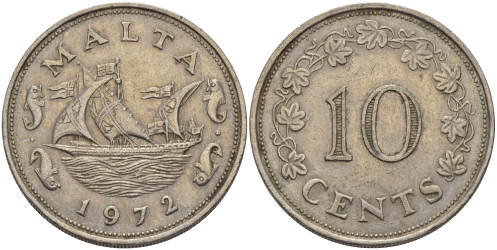 МАЛЬТА 10 ЦЕНТОВ 1972 ГАЛЕАС ГРАНД МАСТЕР KM 11 медно-никель 82-425