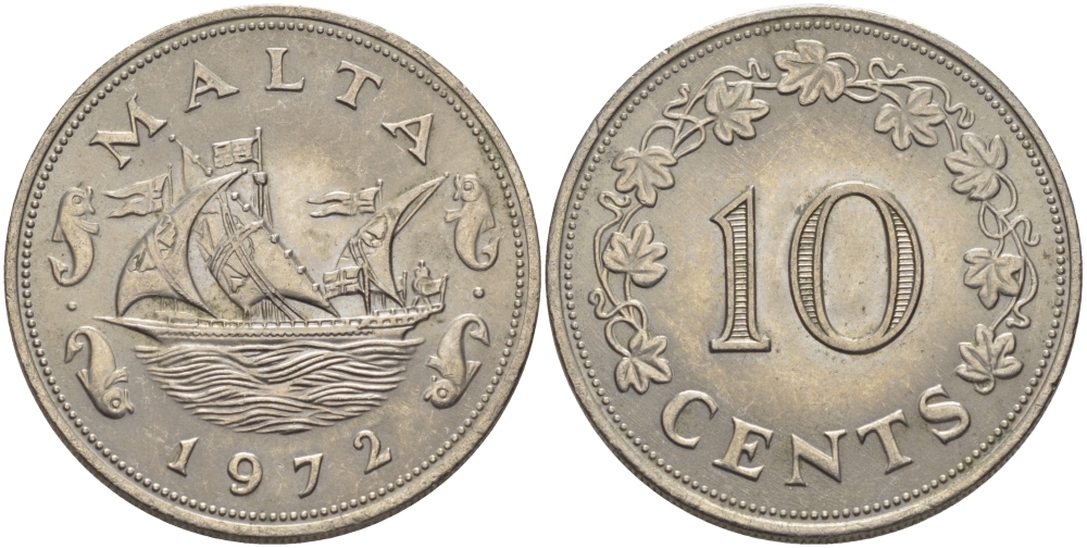 МАЛЬТА 10 ЦЕНТОВ 1972 ГАЛЕАС ГРАНД МАСТЕР KM 11 медно-никель 82-631