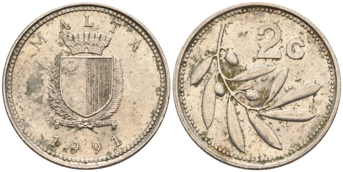 Мальта 2 цента 1991 оливковая ветвь KM 94 медно-никель 4585-1262